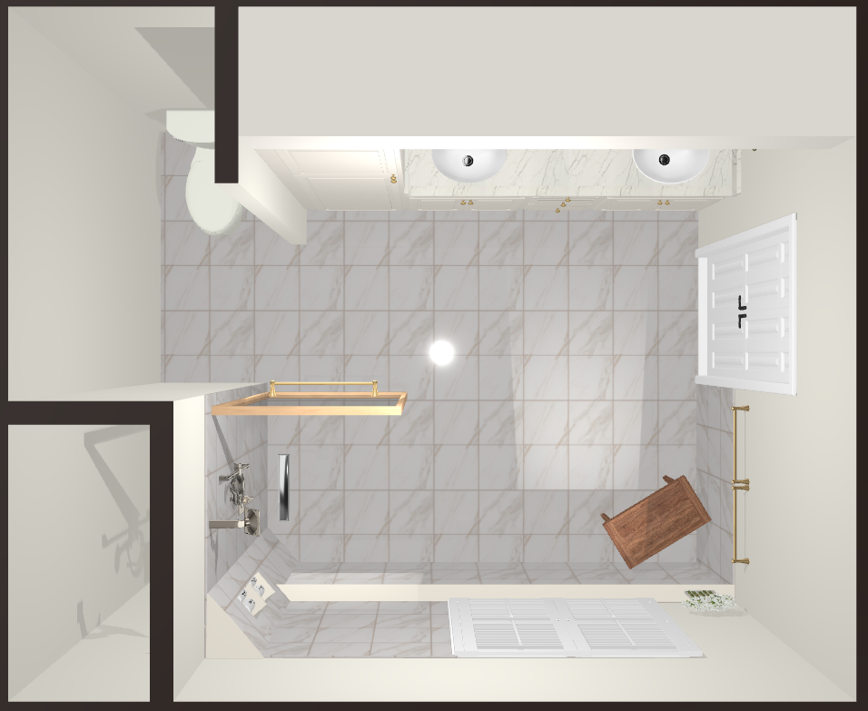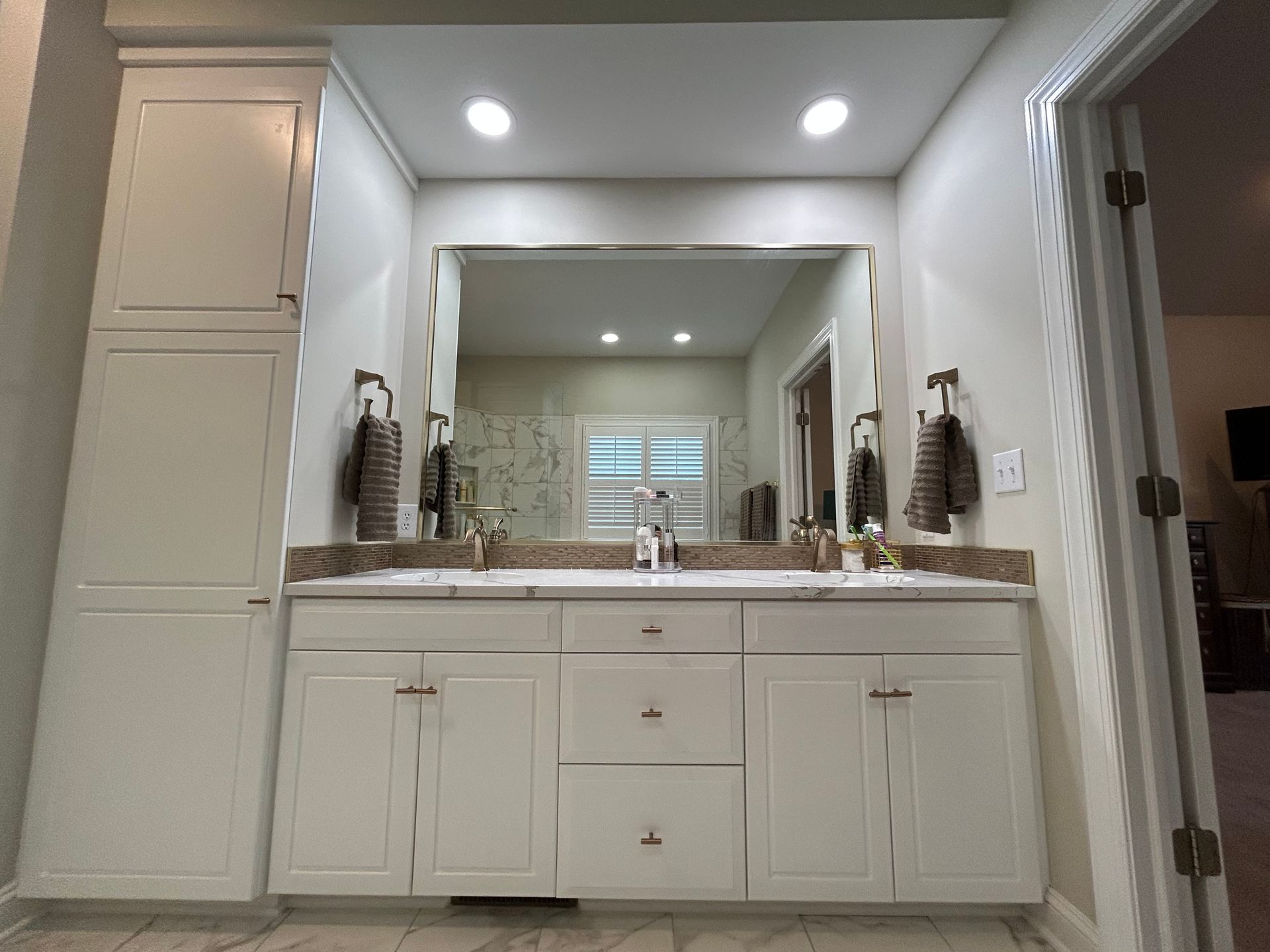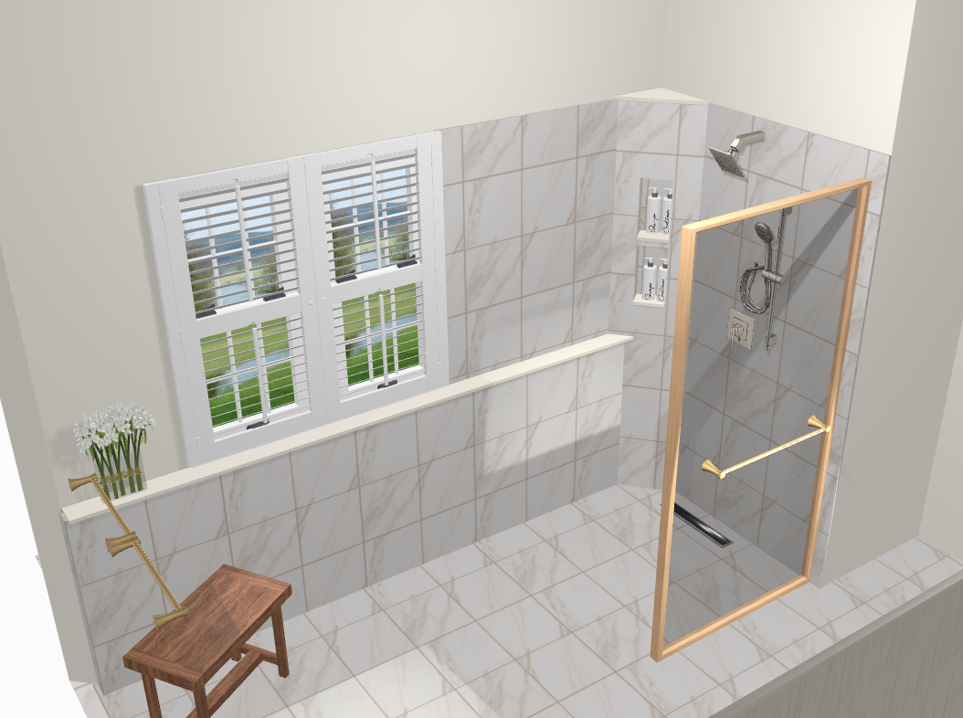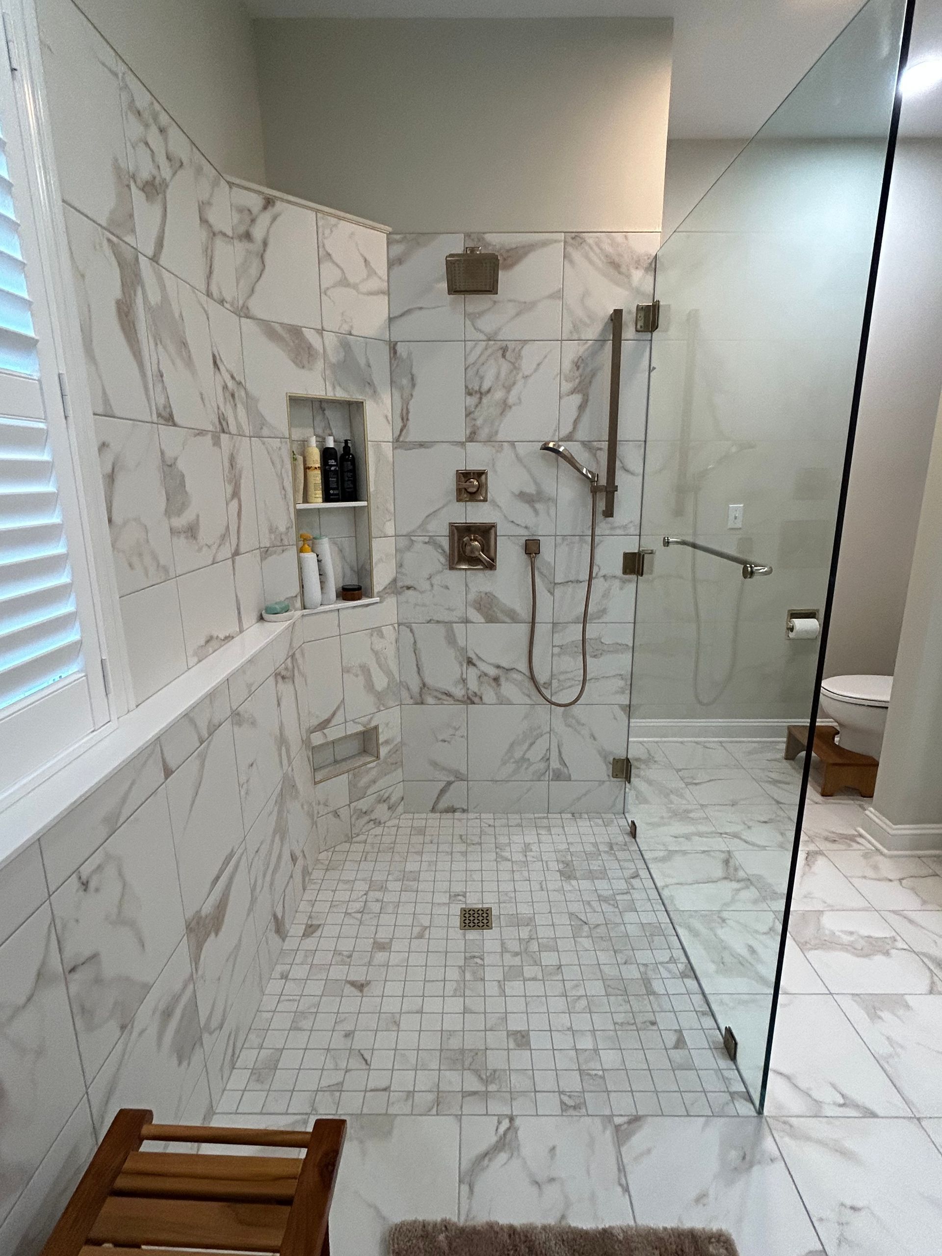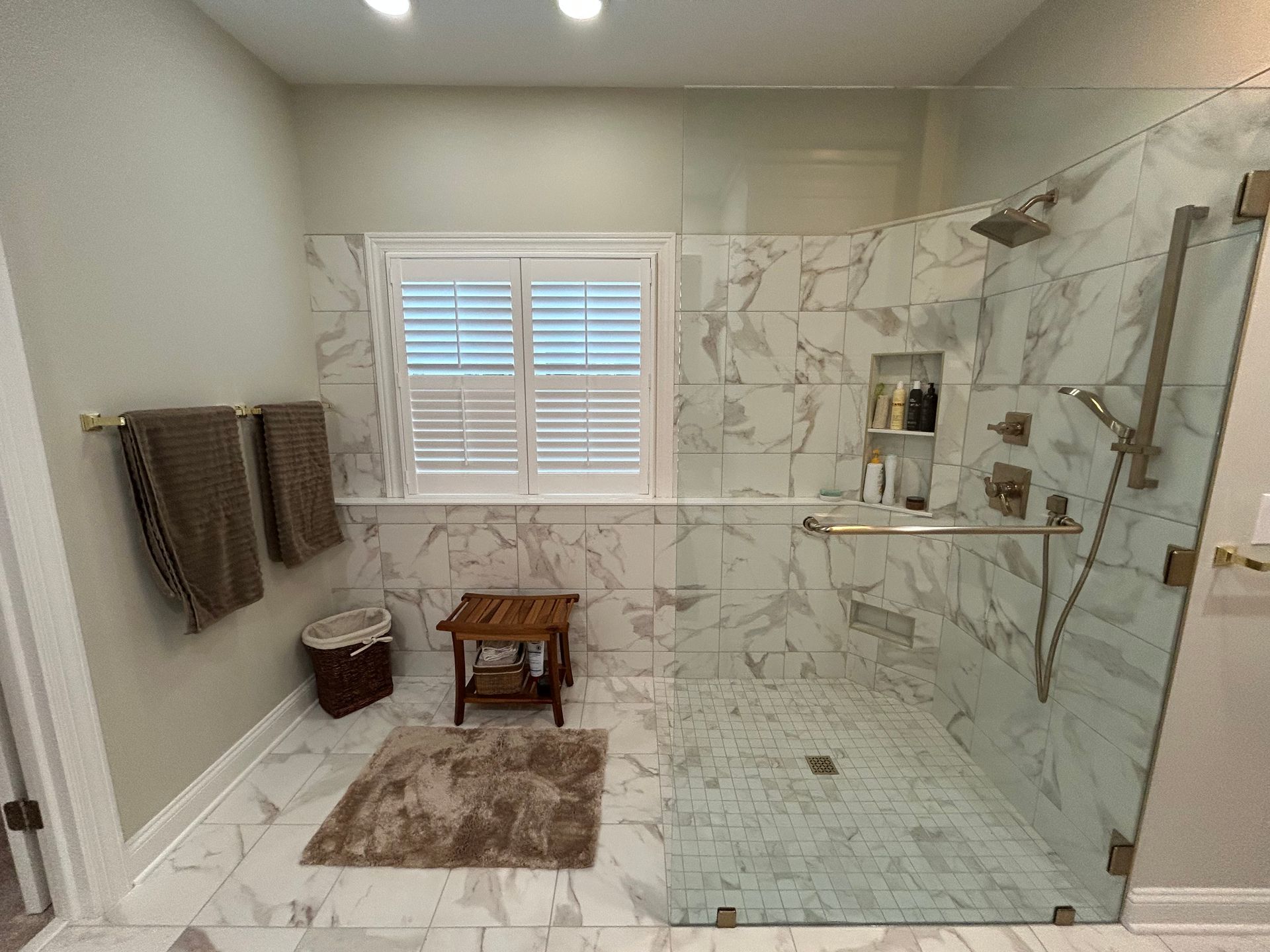 The new curbless walk-in shower features 2x2 Carrara mosaic tile on the shower floor for added texture and safety, paired with a single stationary glass panel that maintains an open, airy feel. The result is a refined, low-maintenance space that blends beauty with everyday functionality.