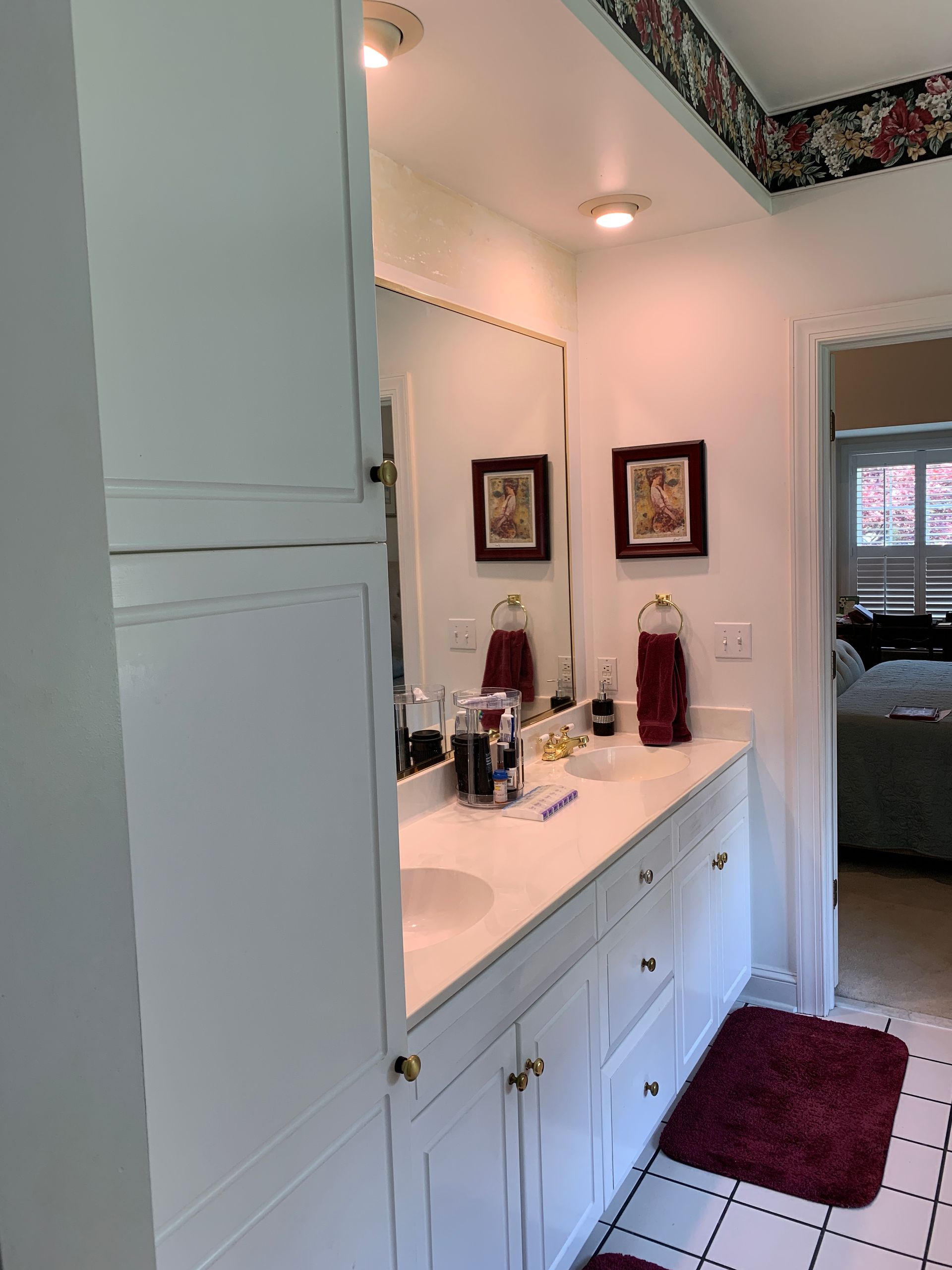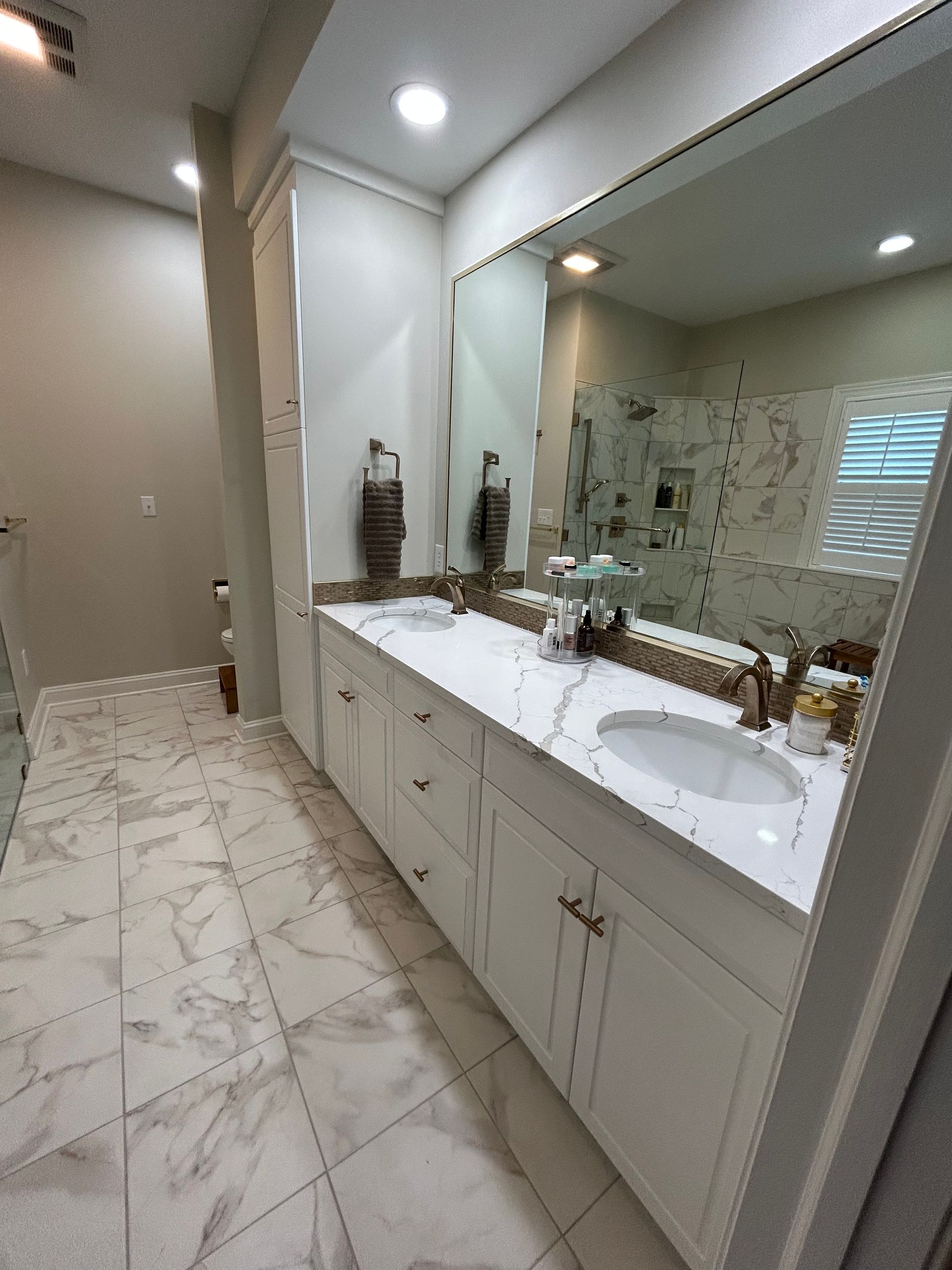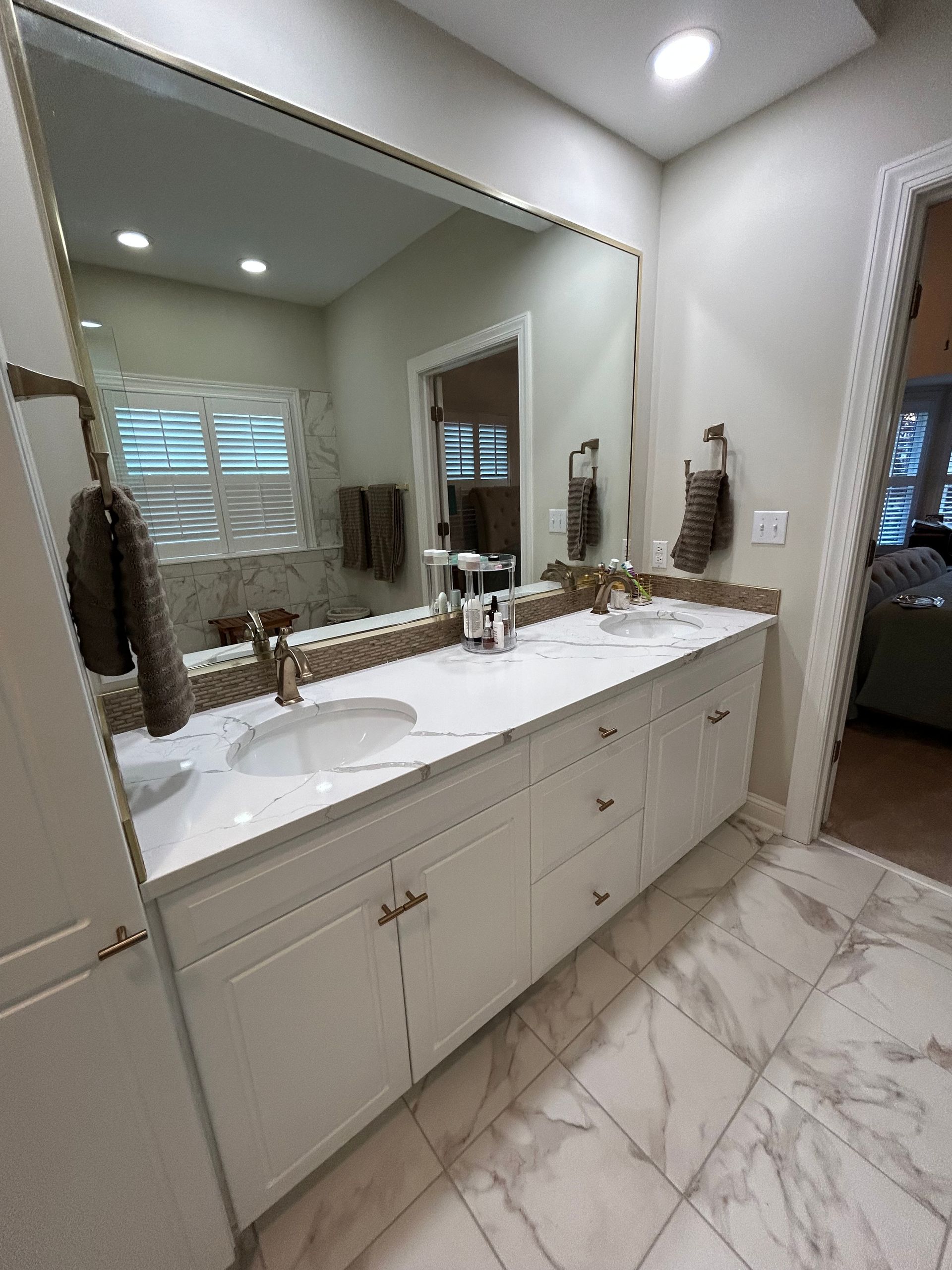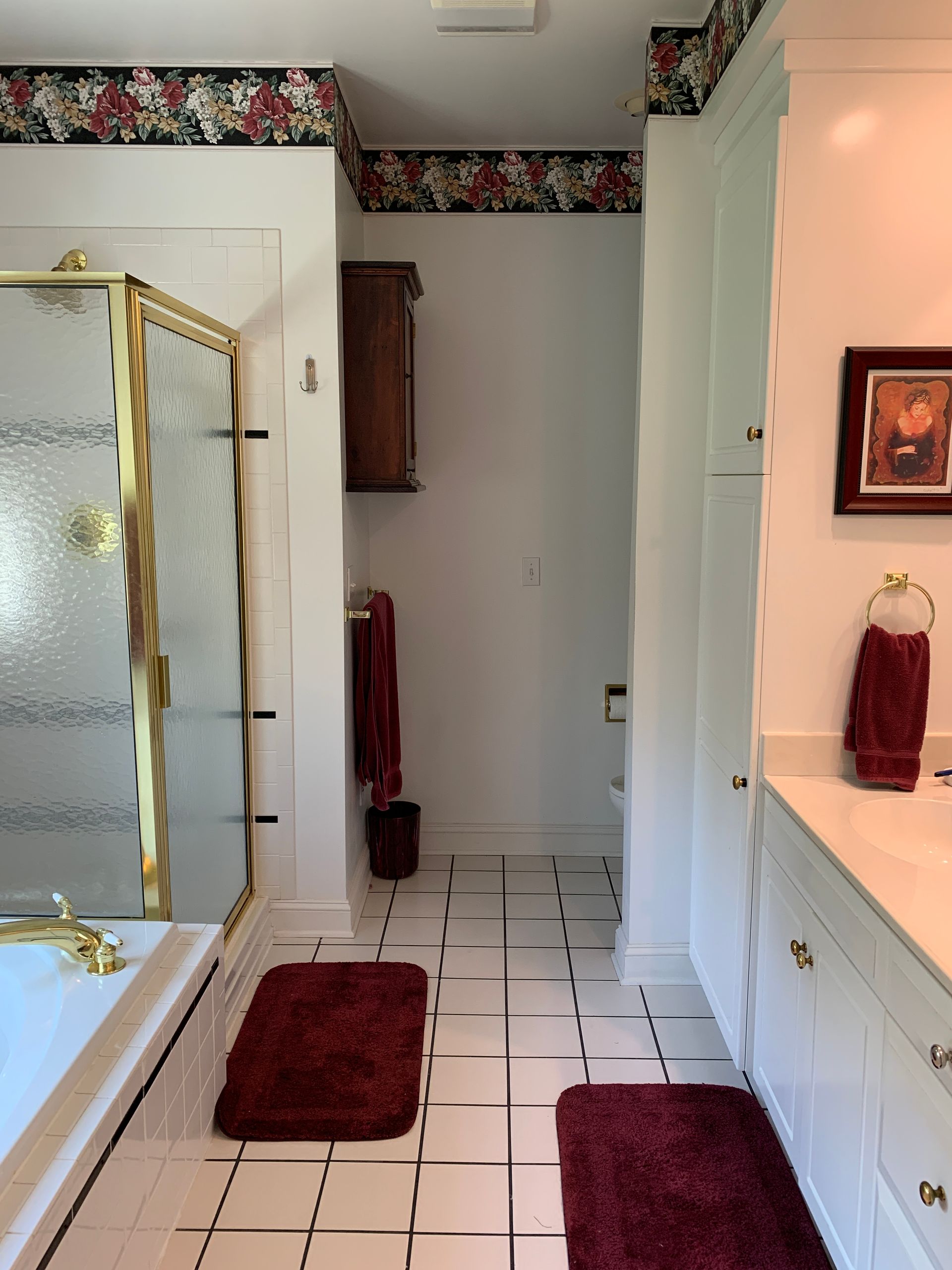 In this elegant bathroom remodel, we removed the existing tile shower, built-in tub deck, and flooring to make way for a more open and modern layout. Classic 12x12 Carrara tile was installed throughout the main floor and shower walls, creating a clean and cohesive look.